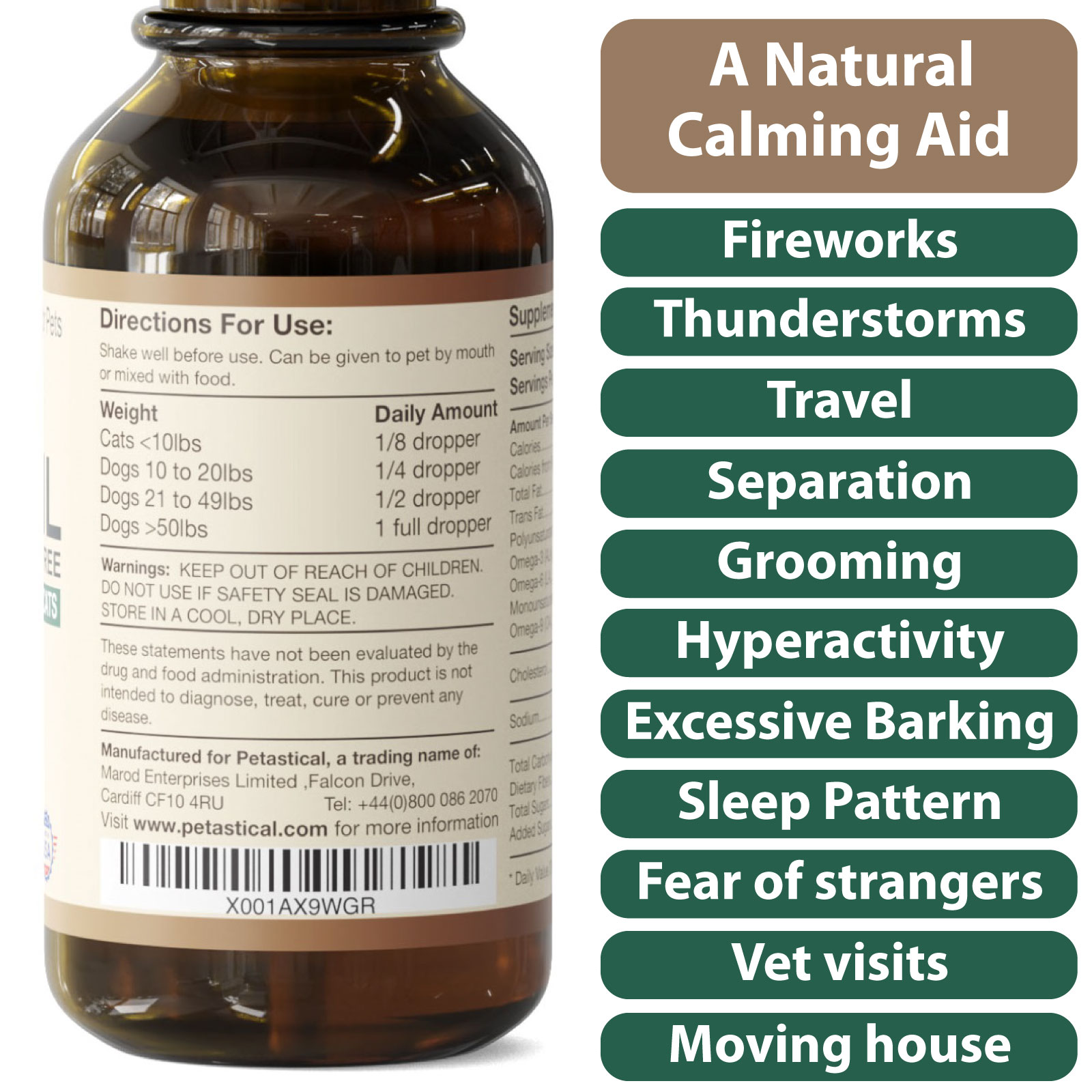 Hemp oil is excellent for relieving stress and anxiety in situations such as thunder storms, fireworks or loud parties, travelling, grooming, hyperactivity, excessive barking, sleep problems, fear of strangers, vet visits, moving house & more.