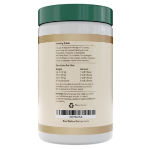 Please see product image for full list of ingredients. Active Ingredients per 2 soft chews: Hemp Seed Oil 200 mg, Hemp Seed Powder 200 mg, Chamomile 150 mg, Ginger 100 mg, Passion Flower 100 mg, Thiamine Mononitrate 60 mg, L-Tryptophan 30 mg. Inactive Ingredients: Brewer’s Dried Yeast, Canola Oil, Dried Potato Product, Flaxseed, Glycerin, Lecithin, Maltodextrin, Mixed Tocopherols, Natural Flavoring, Rosemary Extract, Sorbic Acid, Tapioca Starch, Vegetable Oil, and Water.